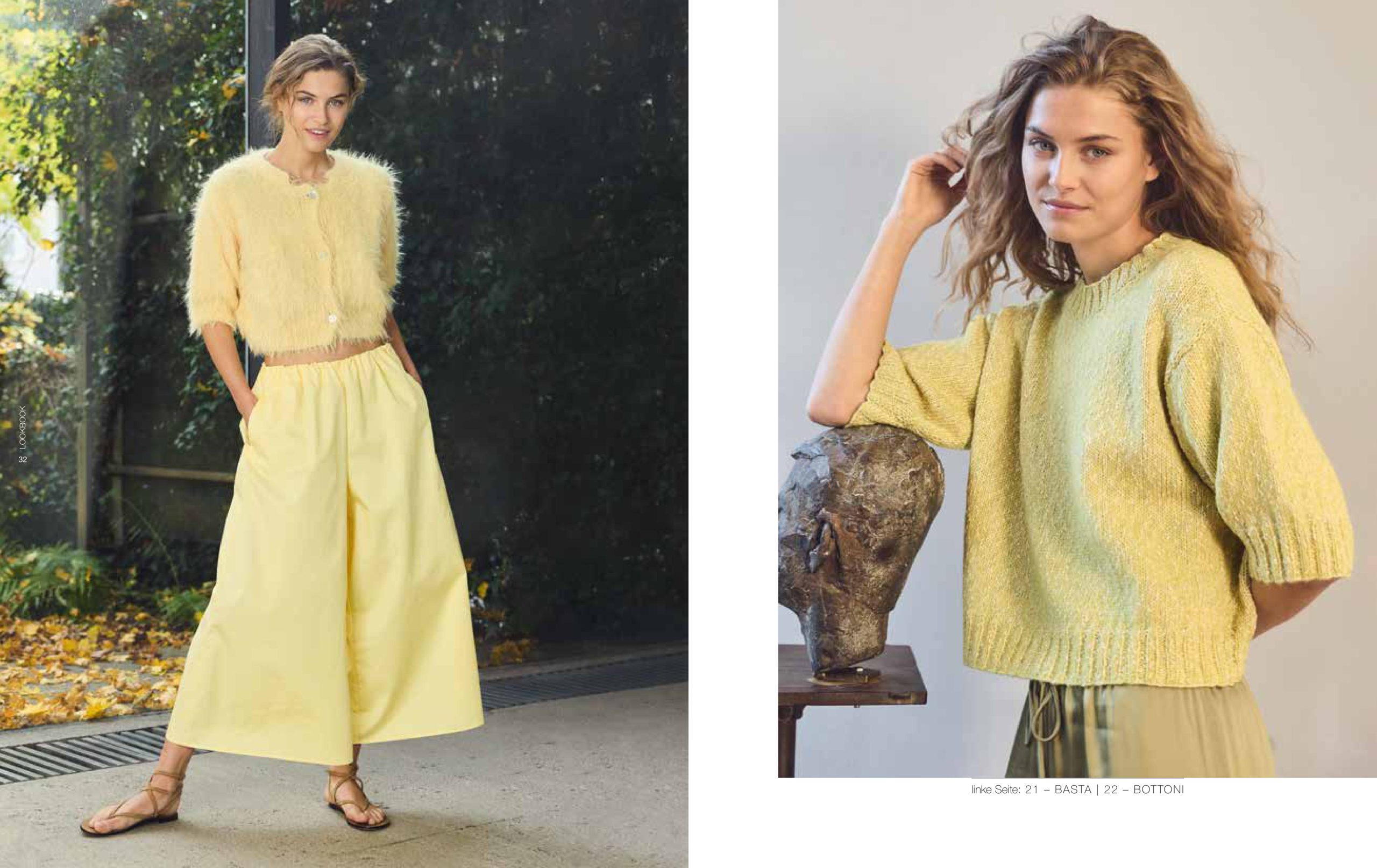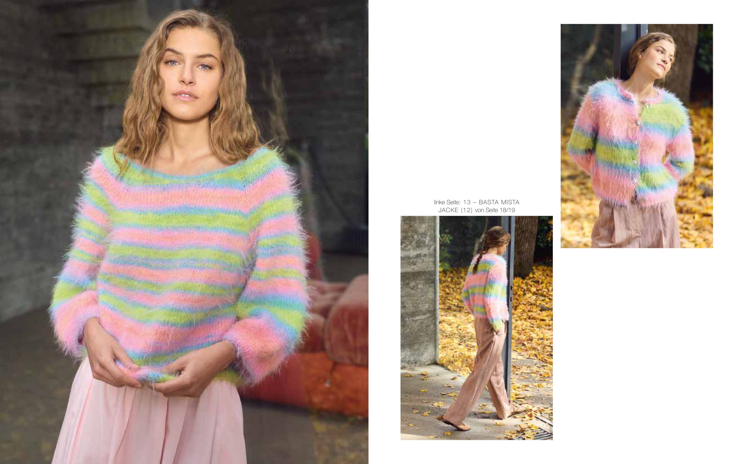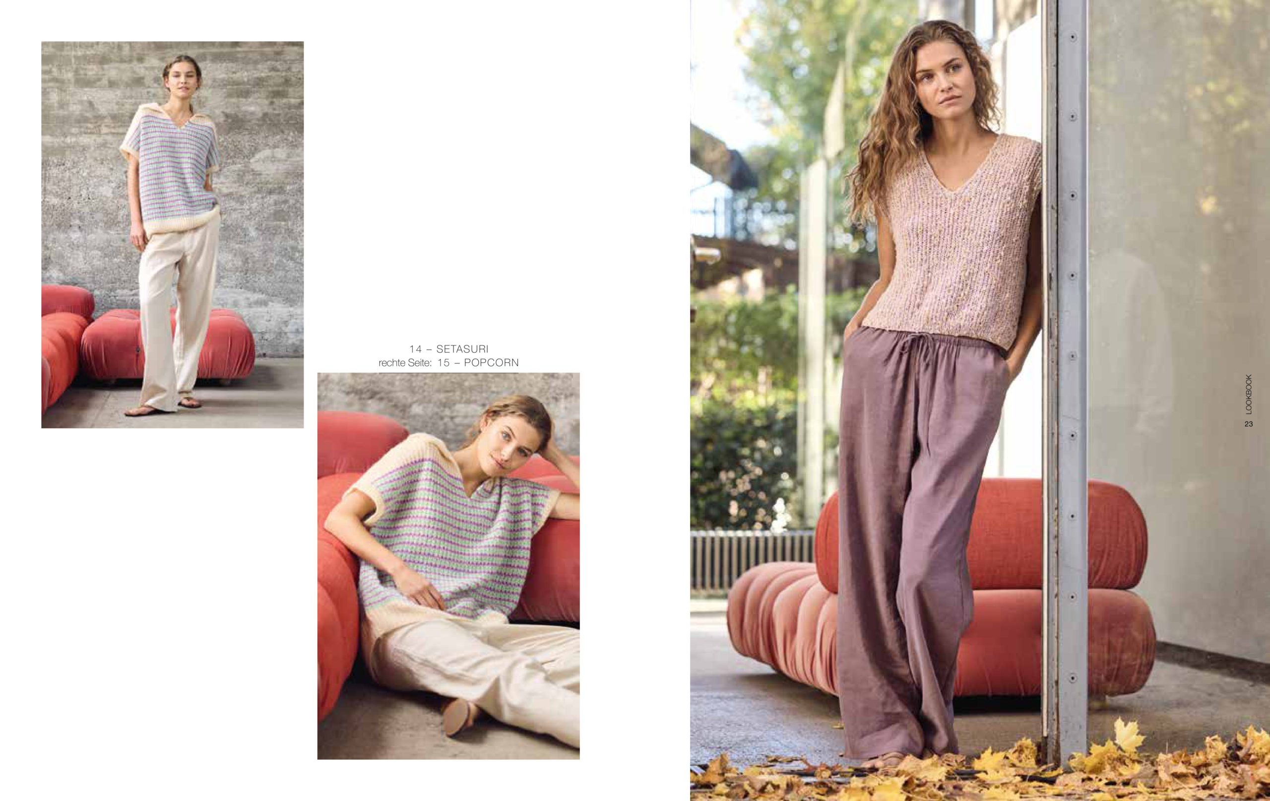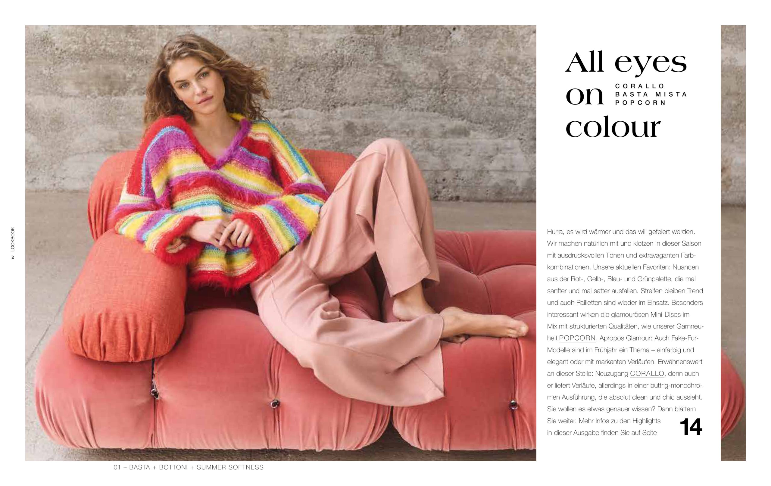 Unsere aktuellen Favoriten: Nuancen aus der Rot-, Gelb-, Blau- und Grünpalette, die mal sanfter und mal satter ausfallen. Streifen bleiben Trend und auch Pailletten sind wieder im Einsatz. Besonders interessant wirken die glamourösen Mini-Discs im Mix mit strukturierten Qualitäten, wie unserer Garnneuheit POPCORN.