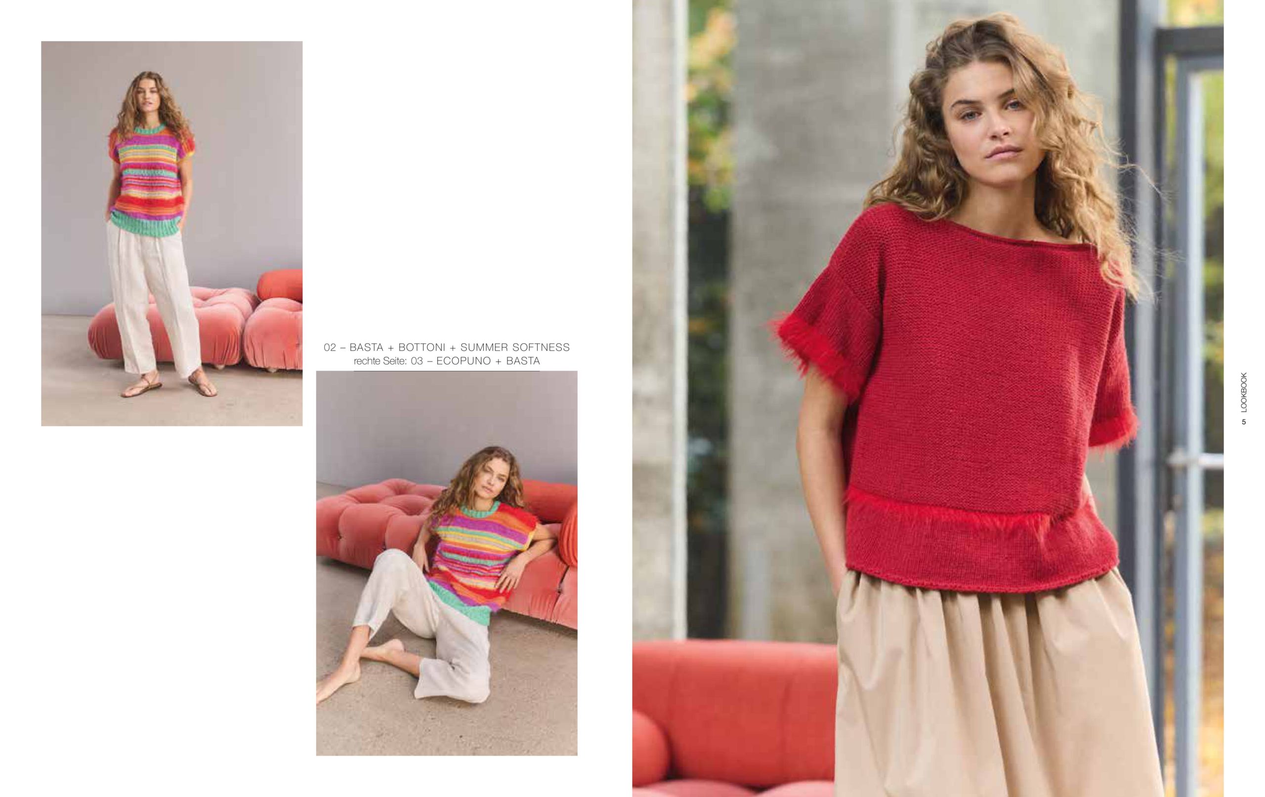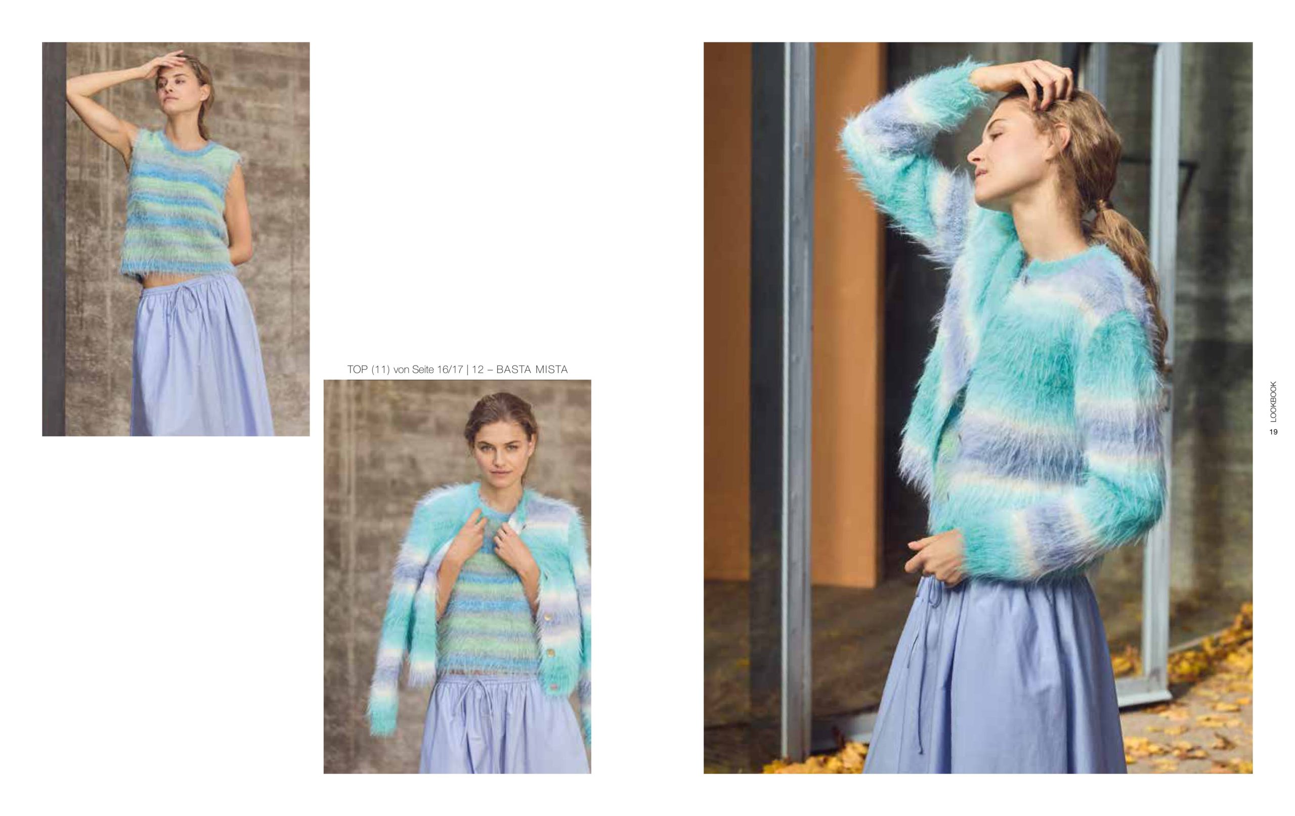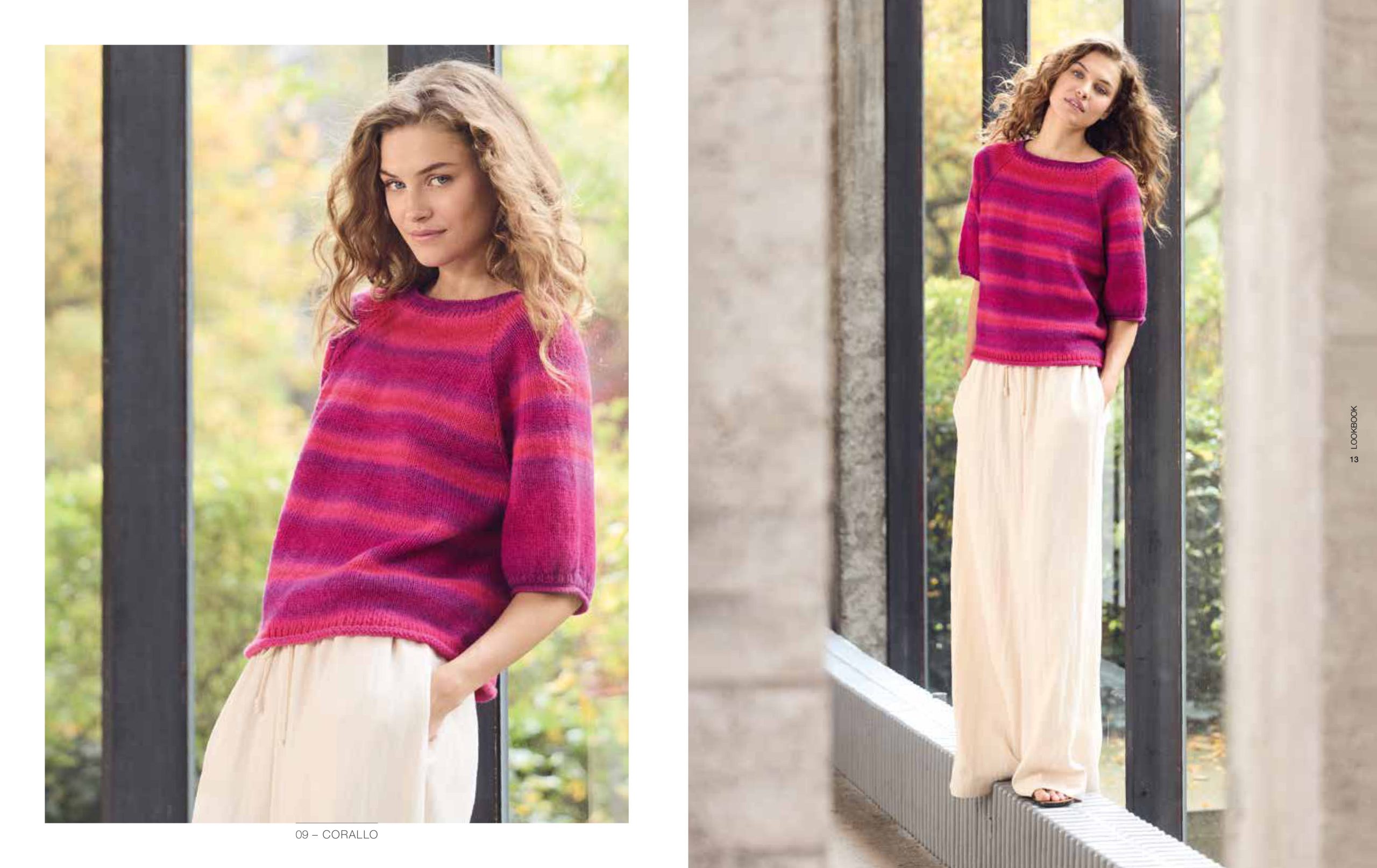Unsere aktuellen Favoriten: Nuancen aus der Rot-, Gelb-, Blau- und Grünpalette, die mal sanfter und mal satter ausfallen. Streifen bleiben Trend und auch Pailletten sind wieder im Einsatz. Besonders interessant wirken die glamourösen Mini-Discs im Mix mit strukturierten Qualitäten, wie unserer Garnneuheit POPCORN.