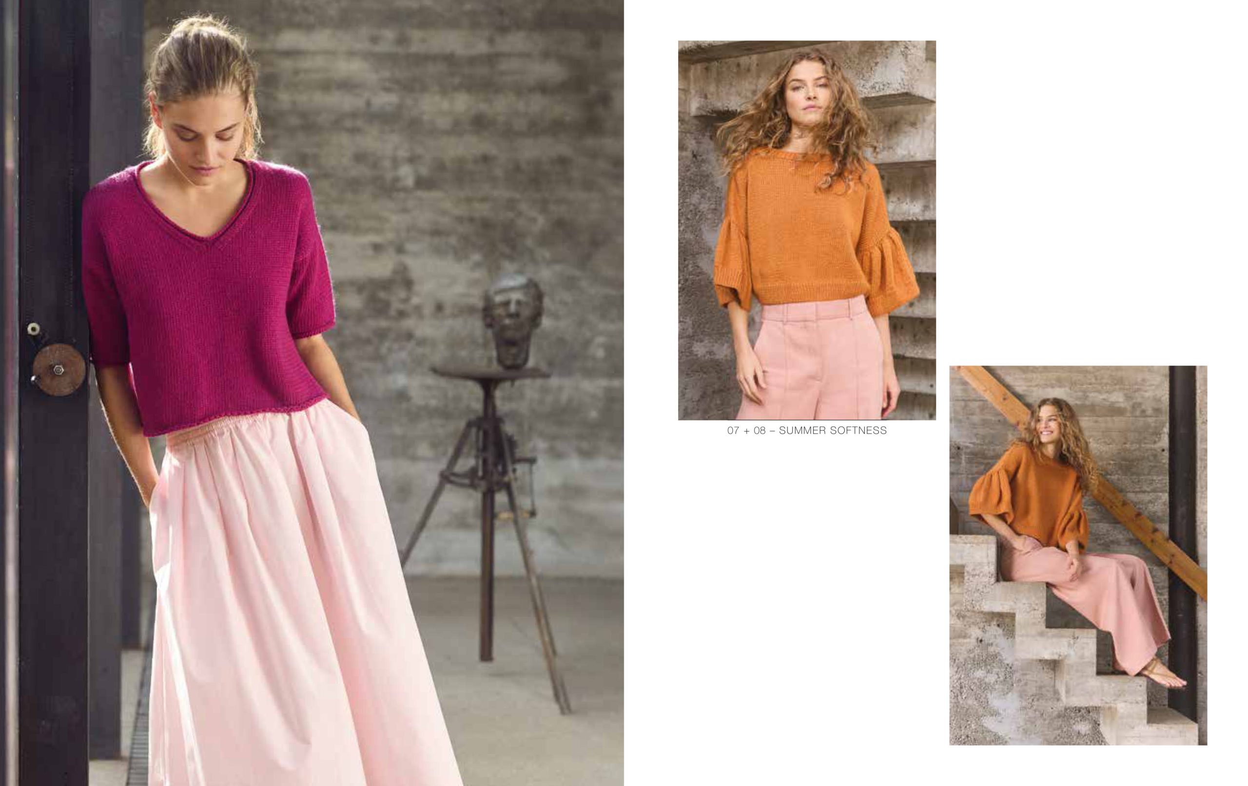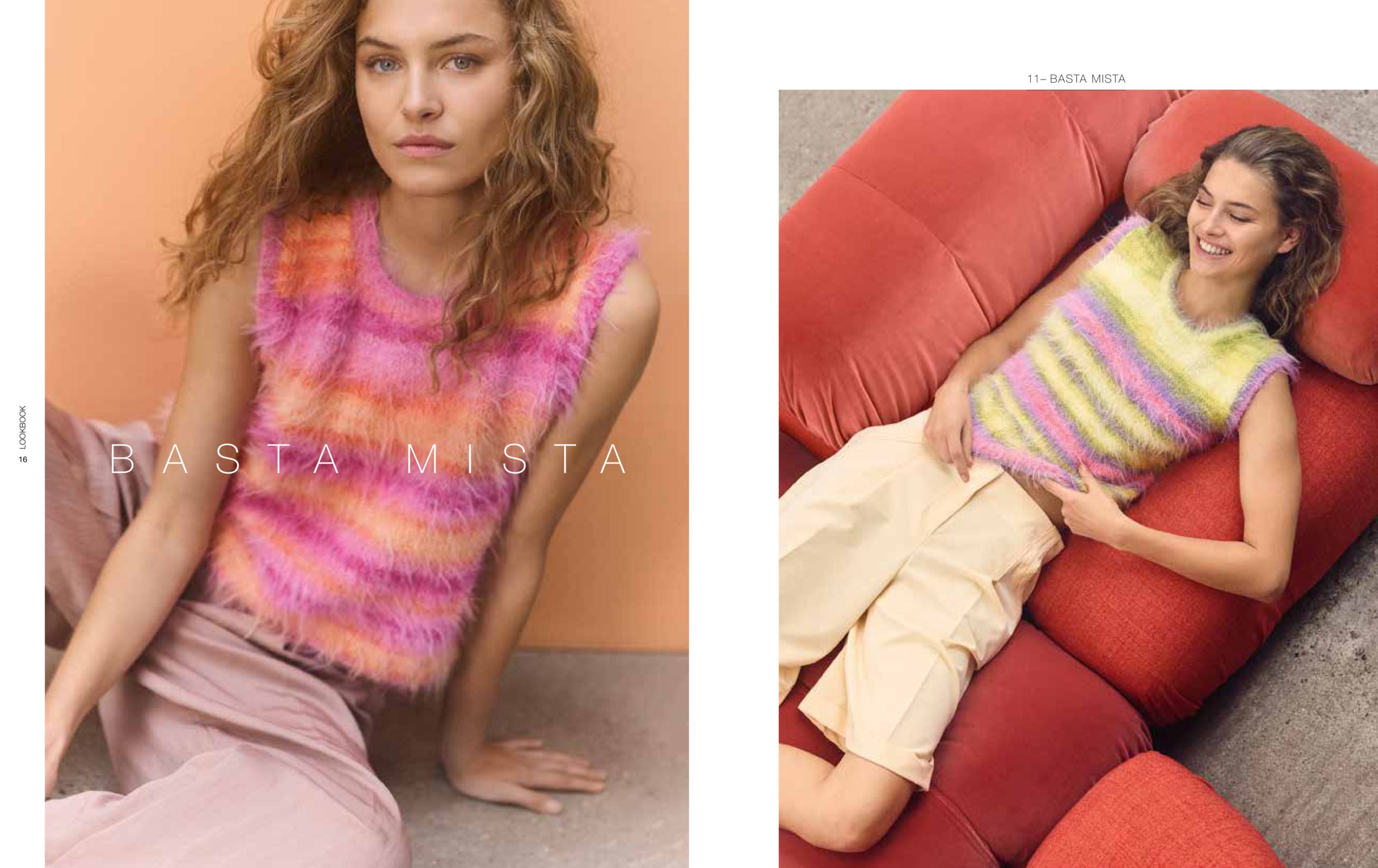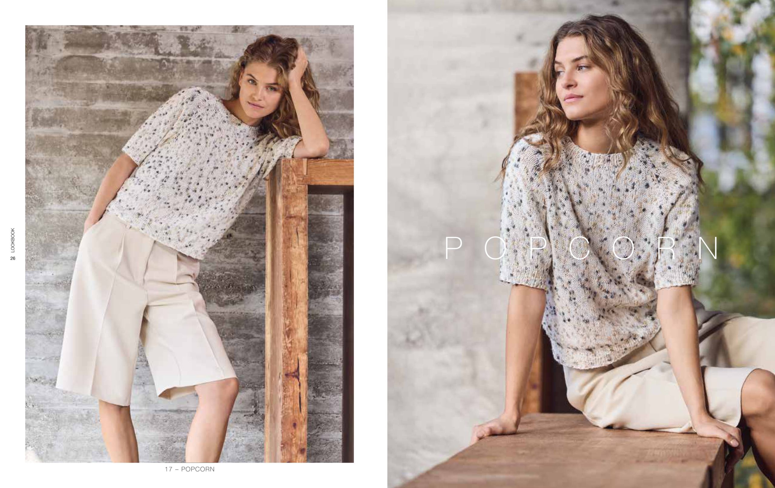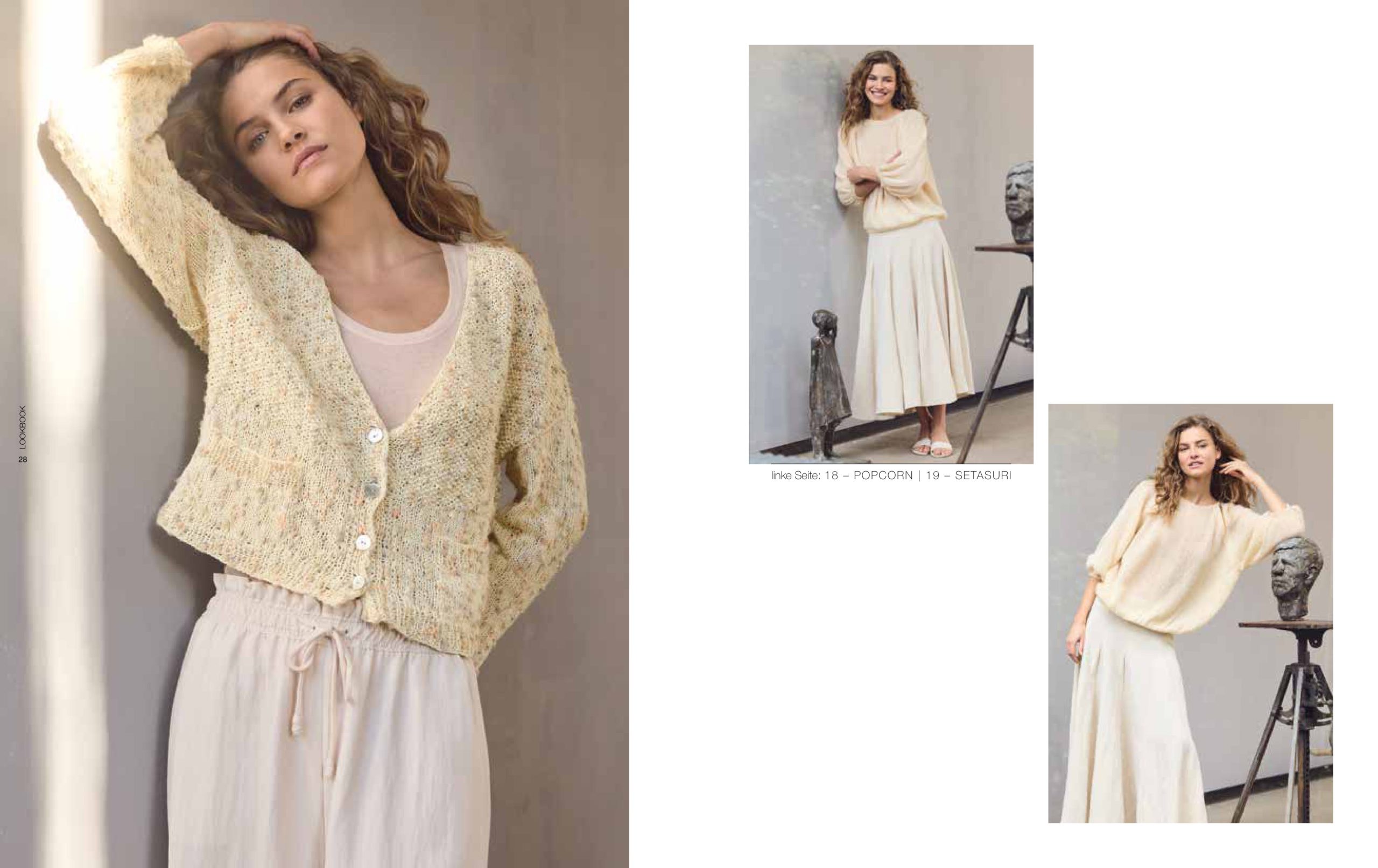Unsere aktuellen Favoriten: Nuancen aus der Rot-, Gelb-, Blau- und Grünpalette, die mal sanfter und mal satter ausfallen. Streifen bleiben Trend und auch Pailletten sind wieder im Einsatz. Besonders interessant wirken die glamourösen Mini-Discs im Mix mit strukturierten Qualitäten, wie unserer Garnneuheit POPCORN.